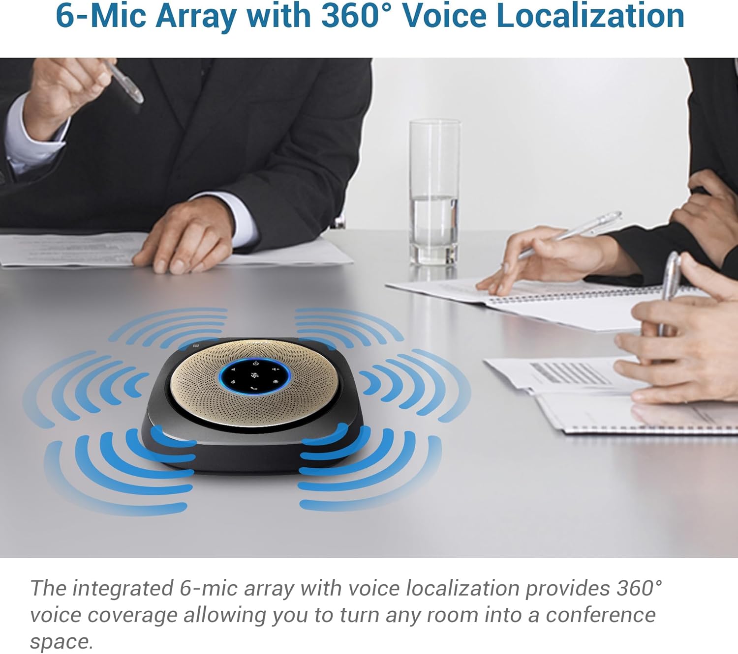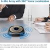 - 360° Multi Microphone Pickup: Six microphones strategically placed for universal sound detection. This portable meeting speaker ensures every participant’s voice is captured—ideal for dynamic, collaborative sessions.