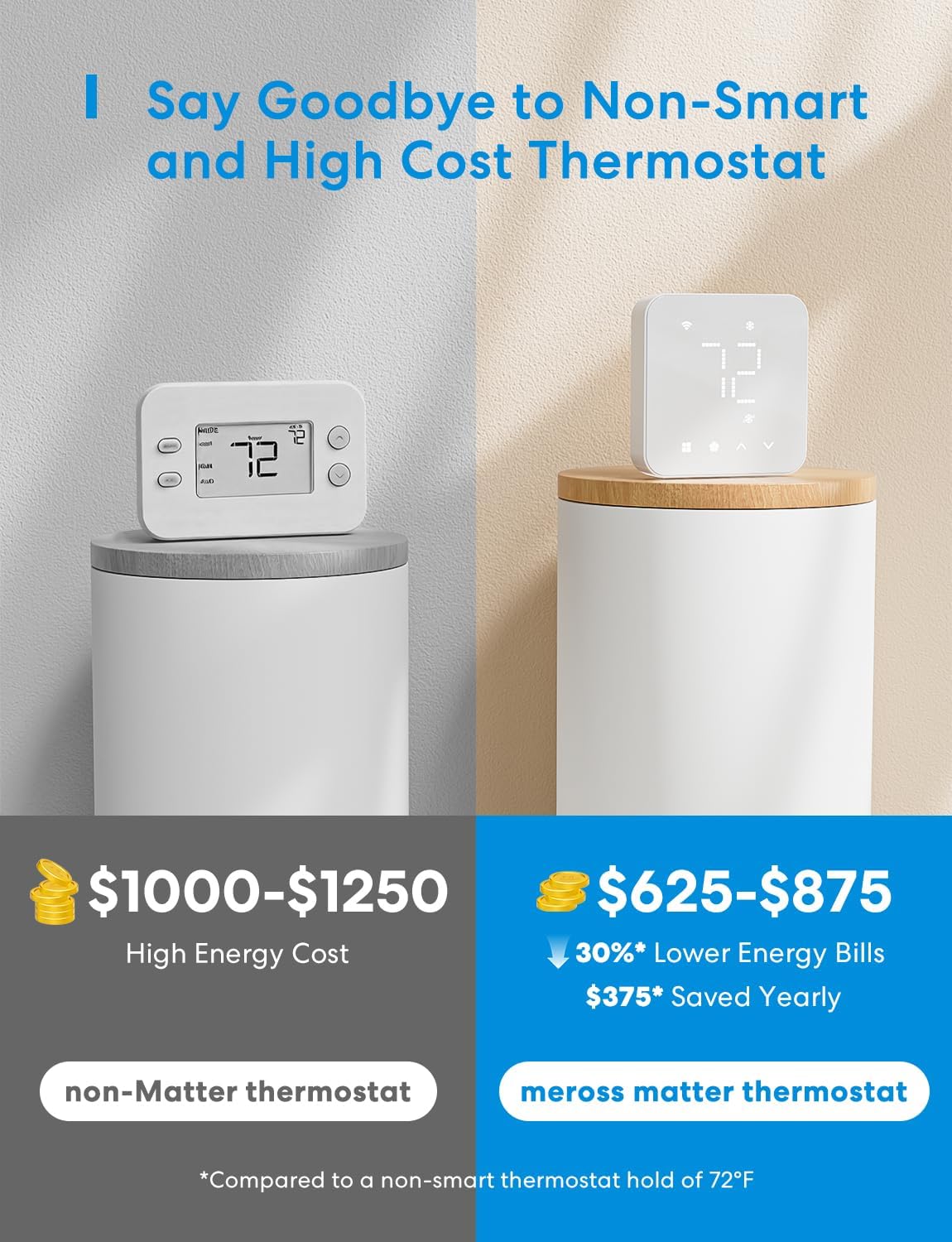 Upgrade your home comfort with the meross Smart Thermostat, designed for broad compatibility with 95% of HVAC systems and seamless integration with Matter platforms like Alexa, Apple Home, and Google Assistant. Enjoy flexible 24/7 scheduling, intuitive app and voice controls, and smart alerts for optimal energy savings and peace of mind. Sporting a sleek, modern design, this Wi-Fi thermostat from meross is easy to install and fits any decor, making it a must-have for smarter, more efficient home climate control.