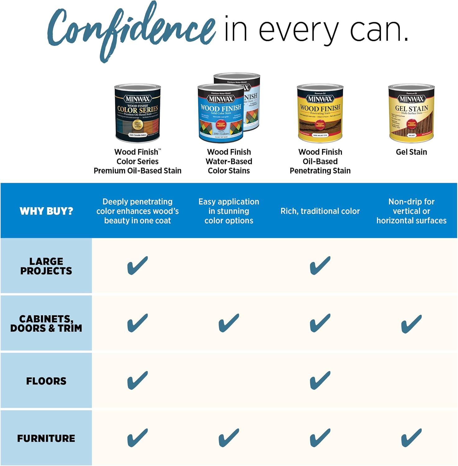 - One coat wood stain: Get strong, rich color and enhance wood grain in a single pass. Perfect for furniture stain projects.